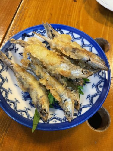 先付はコイワシの天ぷら!めっちゃボリュームあります!美味しいのであっという間になくなったのをみて女将さんがおかわりくれました。笑