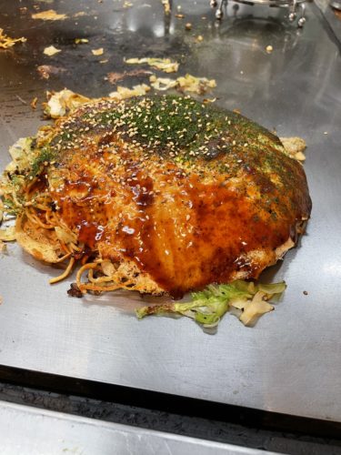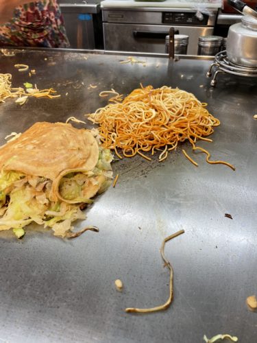 出来上がりました~!辛麺と普通のそばのダブルのお好み焼き!おいしそうでしょう!ヘラで切り分けていただくと、めっちゃ美味しい~!あせっていただくとやけどするので慎重に、でもあせっていただきます。笑