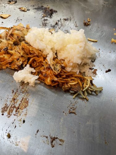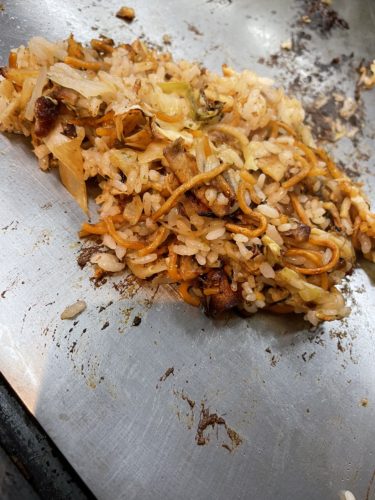 ある程度食べ進めていくとお母さんがごはんを出してくださいました~!ありがたい~!少しお好み焼きをのこしておいてごはんを投入して混ぜながら鉄板に押し付けながら焼き目を付けていきます。
