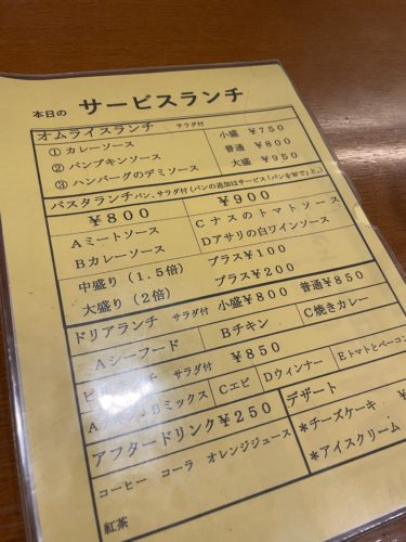 メニューをみてみるとスパゲティとオムライスがメインのメニューのようです。私は大好物のオムライスを!しかもハンバーグ入り!一緒に行った方はトマトとナスのパスタをお願いしていました!