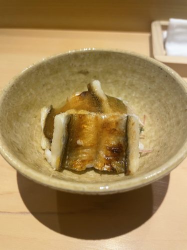 瓶ビールで乾杯させていただいてお食事がスタートです。まずは焼きアナゴときゅうりの酢の物からいただきます。高級食材と化したアナゴをたっぷり使ってくださってほんとありがたいです。そしてめっちゃ美味しい~!さすがですね!