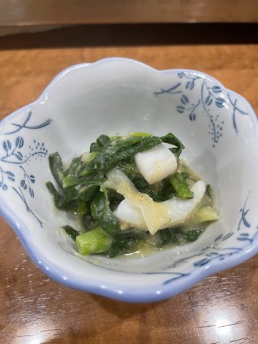 まずは焼酎で乾杯!みーちゃんも久々でしたが元気そうでした!お父さんもお元気そうで何よりです。まずは先付からいただきます。イカとニラの和え物から!いつもの美味しさ!実家に戻った気持ちになれて落ち着けます。