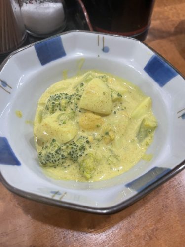 ブロッコリーと玉子サラダをカレーパウダーで和えたこちらもお酒がぐいぐいすすむタイプですよ~!
