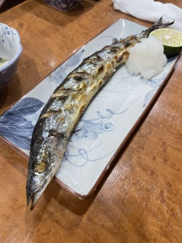 さんまの塩焼きがメニューにあったのでお願いしました!そういえばさんまに季節になってこうして一本をまるごと焼いていただくのは初めてかも~!今年もさんまが不漁で個体の大きさが例年の半分くらいしかないって聞いていたのでずっと敬遠していました。
