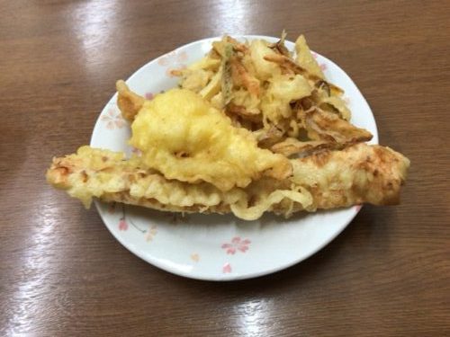 順番がきたので中に入ってまずは天ぷらを取ります!こちらのかき揚げが超おいしんですよね~!冷めてても全然おいしい!中にジャガイモが入っているです!ポテト状で!これがポイントになってますよ~!ゲソとちくわ天もいただきました~!いや~おいしい~!