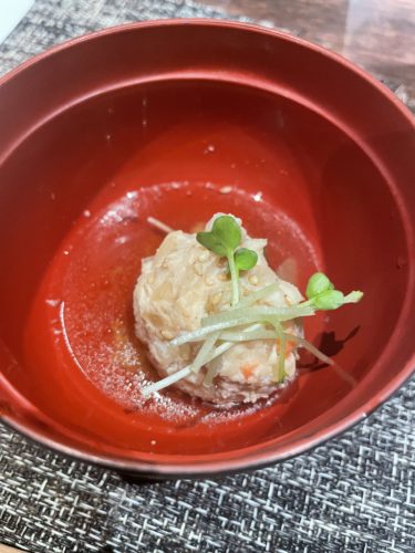 瓶ビールで乾杯させていただいて、最初は先付でつみれが登場しました!お出汁もしっかりでていますね~!
