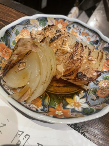 なんと甘玉ねぎという鉄板メニューが!鉄板の上で大きな玉ねぎを焼いていきます。そしてそのまま登場、、、いただくと、、、甘い!確かに甘い!すごいです!