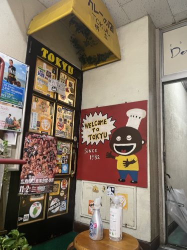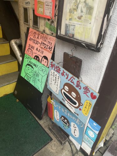 お店の階段をあがるときに個性的な看板を楽しみます。カレーを受け取って歩いて戻ってだいたい10分かかるかかからないかくらいです。