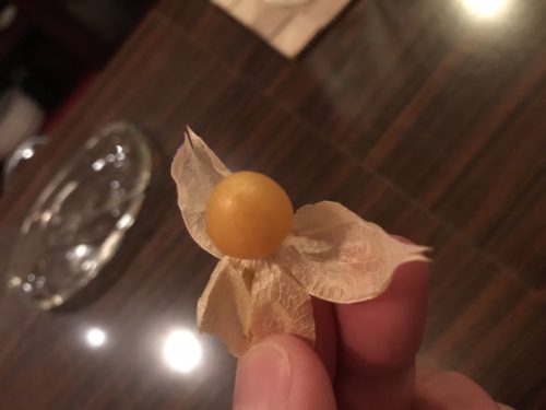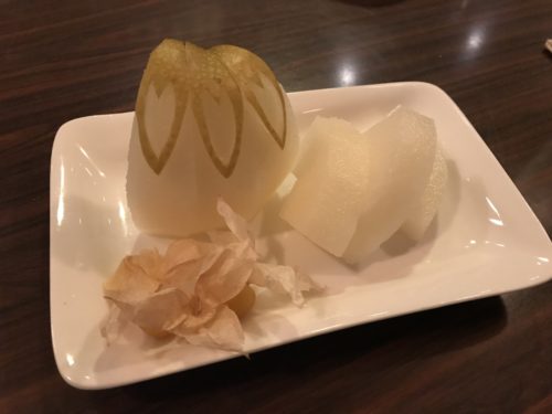 梨を切ってもらいました!すると鬼灯を付けてくださいました~!こちらもおいしいです~!