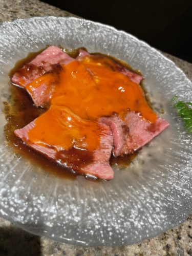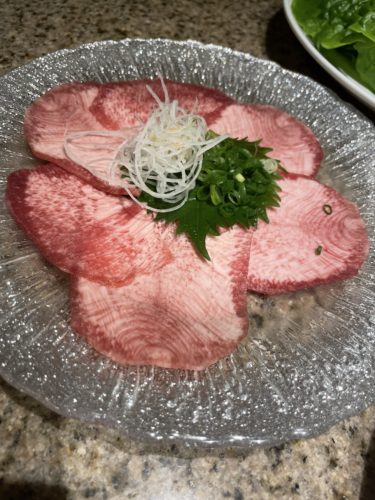 そしてついに牛タンが登場しました!バラの花のように盛り付けされた牛タンを片面だけ炙って裏面は余熱でいただいてみると、これが抜群に美味しい~!あ~今から焼肉食べたい~!