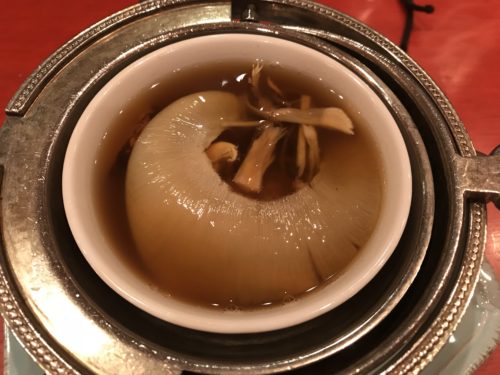 開けてみると、そこにはフカヒレが~!しかも松茸も~!ものすごくいい香りがします!冬虫夏草も入っていました!いただいてみると、、めちゃくちゃおいしい~!素材そのものからでている出汁なのでとっても品があって自然な風味に仕上がっています。超美味ですよ~!