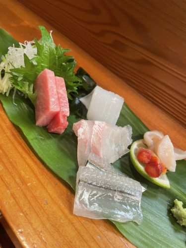 まずはお刺身をいただきます。大トロ、イカ、夜泣き、サヨリ、鯛、ミル貝と!どれもとっても美味しい!イカも甘い~!最高です!
