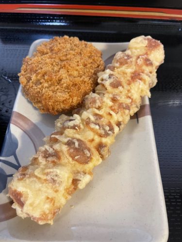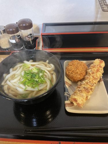 かけうどんの中と天ぷらとちくわとコロッケをお願いしました!