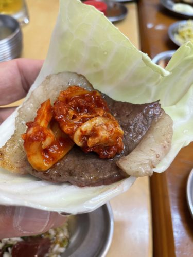 炭火で焼いてキャベツに巻いてキムチと一緒にいただくともう止まらない!