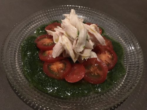 ということでまずは60.0度火入れの蒸し鶏をお願いしました~!一目で普通の蒸し鶏と違いがわかります。蒸し鶏のつやが違いますね~。60.0度だとこうなるのかな~と思いながらいただいてみると、超おいしい~!これはおいしい~!いい意味で瑞々しいです!普通蒸し鶏ってパッサパサだったりしますよね~。それがないんです~。すごいですね~!