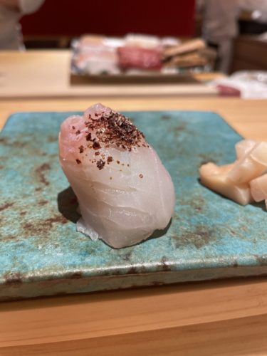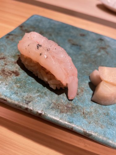 さて、先日ご紹介した宮島鮨まいもんさんの続きです。富山の白えびの次に瀬戸内の天然真鯛が登場しました。レモンのオイルとお塩でいただきます!