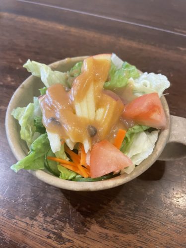 セットでお願いするとサラダとドリンクがついてきます。まずはサラダから!サルさんの特徴はサラダにちゃんとりんごが入ってくることです。りんご好きな私にとったらありがたい!美味しくベジファースト!