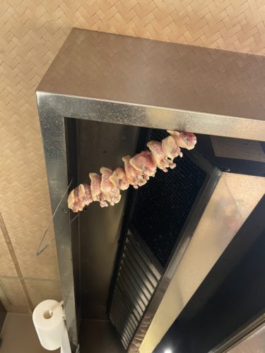 ここで登場したのが手羽先の一夜干し!お店に入ったときにふと上を見上げるとたくさんの手羽先が干してありました。