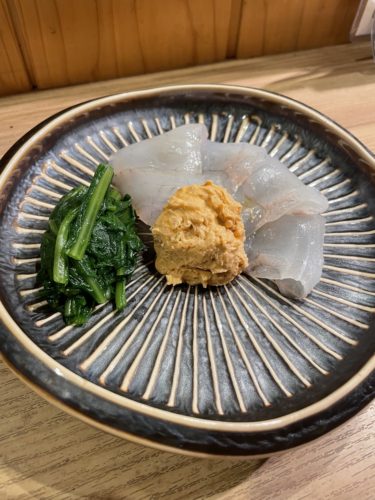 つづいてお刺身はヒラメ!一緒にあん肝がついてきました。あん肝と一緒にヒラメをいただくのは初めてかもしれません!でも淡泊なヒラメにあん肝ってよく考えたらよく合うかも!いただいてみるとやっぱり!これはいい組み合わせです!