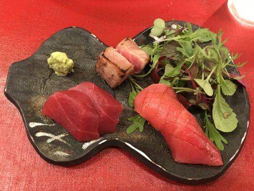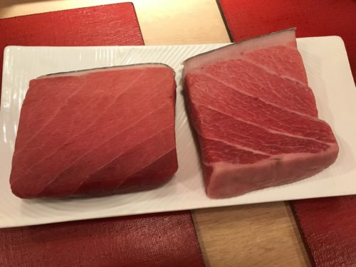 生マグロのさくをみせてくださいました!右が大トロ、左が中トロの部分になるそうです。ということでお刺身にしてもらいました!