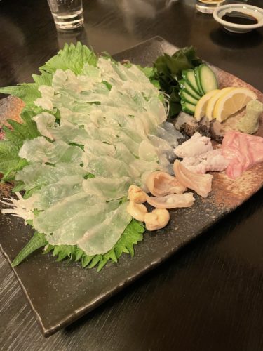 そしてこの日お願いしていたのがオコゼ!オコゼを薄造りにしてもらいました!ポン酢をお願いしていただいてみると、めちゃ美味しい~!内臓などもきっちりと!最高です!フグみたいな感じでいただいちゃいました!笑
