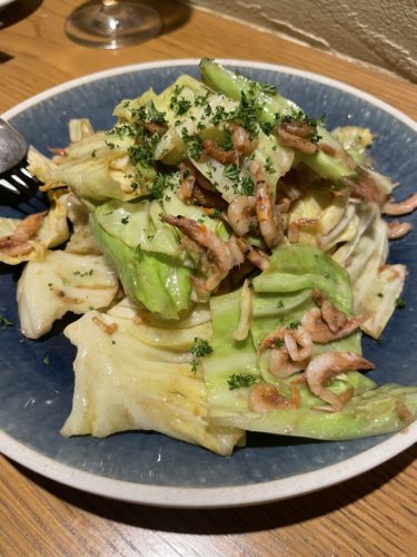 2軒目でしたのでそんなにたくさんは食べれなかったのでワインをたしなむためのおつまみとしてまずはアンチョビキャベツをお願いしました。知人の方はいつもこちらをお願いするんだそうです。注文が入るとマスターがフライパンでキャベツとアンチョビを炒めてくださいます。とってもいい香りがしてきますね~!いただくとめちゃ美味しい~!これはお酒にあいますね~!