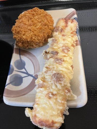 天ぷらはコロッケとちくわ!いつもこのセットです。