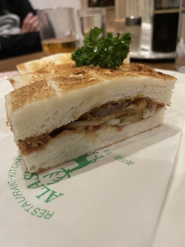 いつも定位置の席があいていたのでラッキー!なぜかこの日はみんなお腹が減っていたようで着席するなりカツサンドって叫んでいました。(笑)まずはおつまみとしてカツサンドをお願いしました!