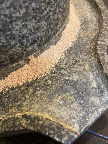 お店の方がインスタグラムののせるための写真を撮影したいとのことで石臼を挽く姿をとってくださいました。(笑)