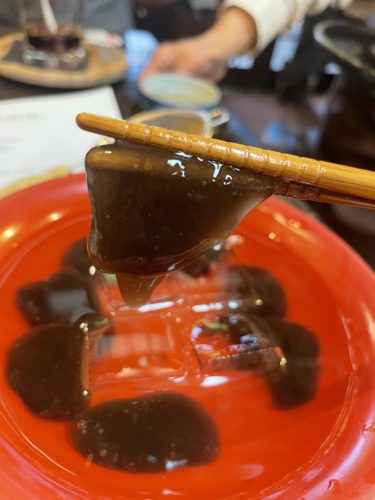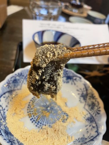 ちょうど本わらび餅も出来上がって自分で挽いたきな粉でいただきます~!本わらび粉100%のわらび餅!本当のわらび餅はこういう色をしているんですよね~!