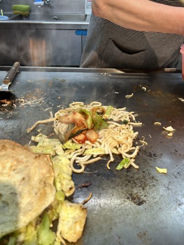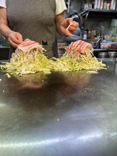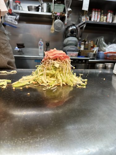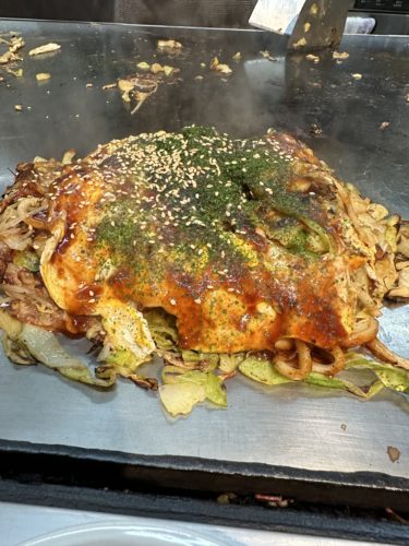 そして出来上がったにんにくキムチお好み焼き!ヘラで切り分けていただいてみると、めっちゃくちゃ美味しい~!ニンニクとキムチ、めっちゃよくあう~!
