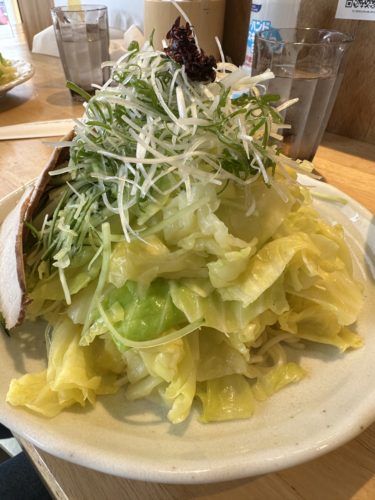 メニューから私は大盛と野菜とトッピングお願いしました!すると目の前で麺や野菜が盛り付けられ始めたのはいいのですが、盛り付けがなかなか止まらない、、、え、ええ、、えええええ!