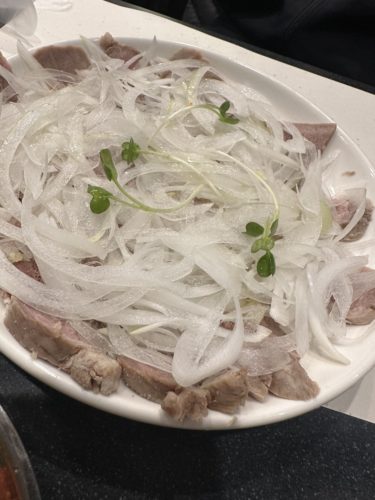 蒸しタンとさらした玉ねぎと塩コショウだと思うのですがこのシンプルな組み合わせだからタンの美味しさが最大限引き出されているだと思いました!