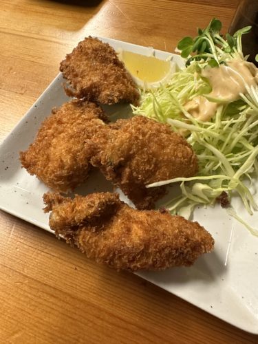 メニューに牡蠣があったのでまずは牡蠣フライを!何気なくたのんだのですがこの牡蠣がめっちゃ美味しい~!いい牡蠣をつかっていらっしゃいますね!