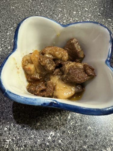 まずはイノシシ肉の煮込みからいただきます。甘辛のいいお味に仕上がっています。これだけでビールをぐいぐいいけちゃいますよ~!