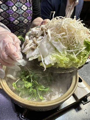 とそこで、、、もう5人前食べたいというご意見が!ひえ~~~!まさか25人前!たっぷりの野菜の上にイノシシ肉を投入して一緒にいただきました!