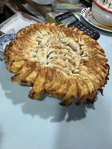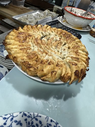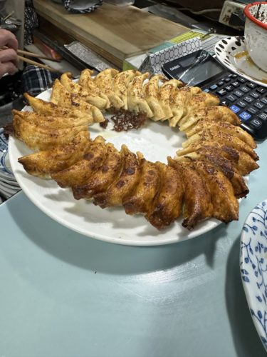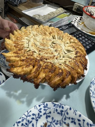 もやしを少しつまみながらビールをのみながら餃子が焼きあがるのを待ちます。お母さんがフライパンにぎっしり餃子を並べて焼いていただきます!
