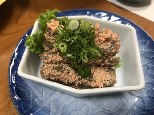 こんにゃくたらこ焼きです!シンプルですが、他ではみたことがないです。たっぷりたらこがつかってあってとってもおいしい~!これはアイデア料理ですね~!
