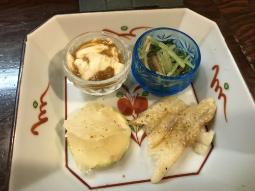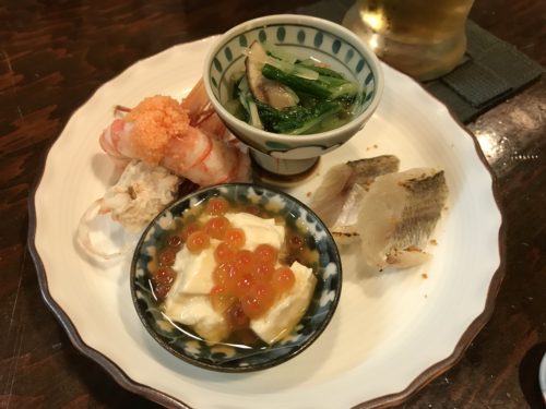 まずはおいしい生ビールで乾杯して先付をいただきます。今宵もとってもおいしい先付でした。一緒に行った友人の先付が私のとは違っていました。そっちも食べてみたかったな~。