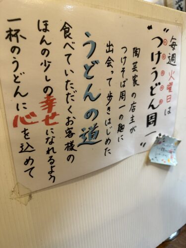 他にも油そばや限定麺などもありました。待っている間にふとみると、毎週火曜日はうどんの日なんだそうです。これは一度食べてみたいですね~!