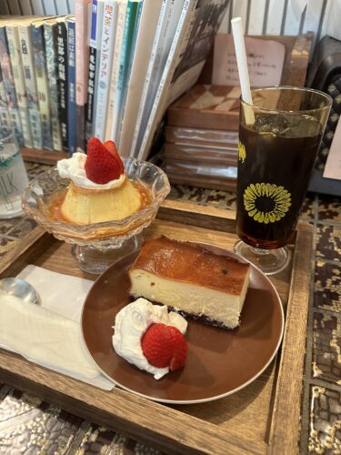続いて私がお願いしたあずきのチーズケーキとプリンが登場しました!それとアイスコーヒーを!これでじっくり打ち合わせができます!(笑)