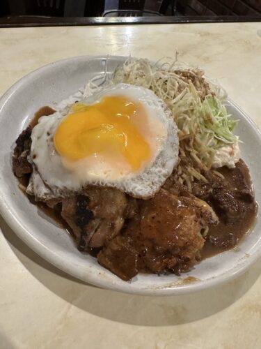 そして私のカツカレースパが!カツも大きいし、パスタもボリューム満点!さらに野菜サラダがこれでもかとのっています。ポテトサラダも!ボリュームは以前と同じです!