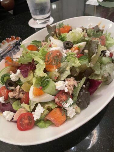 無事打ち合わせが終わってお腹が減ったのでついでに夕食も取って帰りましょうかということでまずはサラダをお願いしました。美しいサラダが登場しました!ボリュームも満点!二人で食べきれるか心配になりますがこれが美味しいので全然食べれちゃうんですよ~!