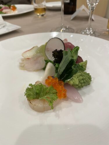 最初の一品は魚介と野菜のサラダから!こういう色合いいいですね~!とっても美しい!料理も芸術なんですよね~!とっても美味しいです!