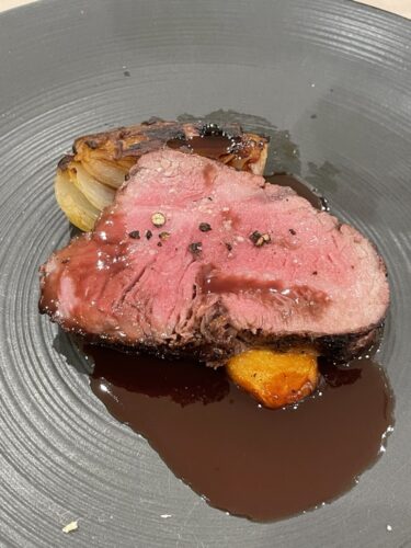 メインのお肉が登場しました!カシス風味のワインソースでいただきます。ほんのり甘みがいいですね~!お肉は赤身なのでとっても食べやすいです!とっても美味しかったです!
