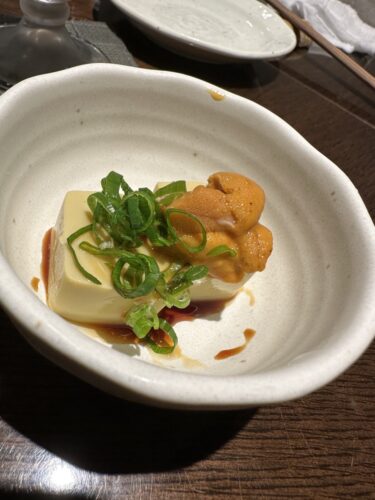 先付にいきなりびっくりしました。蟹みそ豆腐のウニのせ!蟹みそ豆腐が登場するとは!さすがの美味しさです!