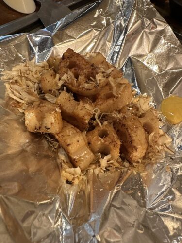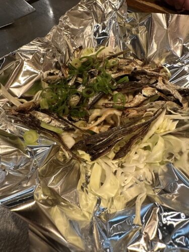 最初の一品がいりぽん。いりぽんってなんだろうって思っていたのですが登場してわかりました。いりこのポン酢ってことですね!お酒のあてにいいですね~くらい思いながらいただいたのですが、これがはちゃめちゃに美味しい~!食べ始めたらとまらない!先輩に内緒でおかわりしちゃいました。(笑)