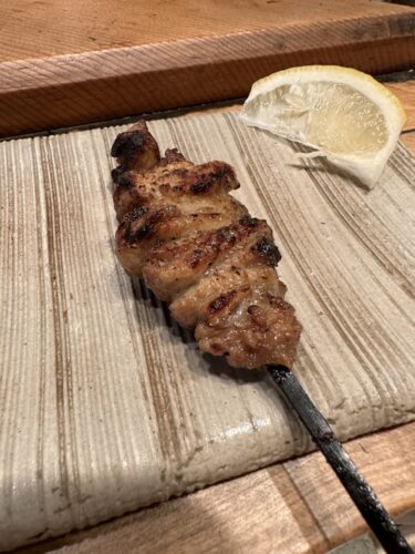 最初の串はかしわでした!一口いただいて焼き加減がかなり特徴的でした。びっくりしました!炭の香りが素晴らしい~!美味しいです!