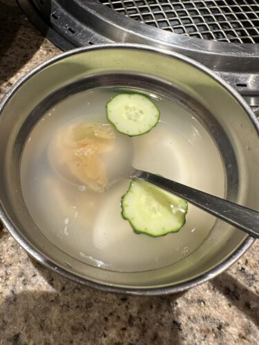 次に水キムチのスープが!これめっちゃうれしい~!水キムチを出してくださるお店なかなかないですからね~!さっぱりしてとっても美味しい~!