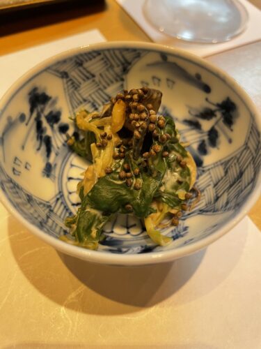 続いてかたくりの花と松の実の和え物が登場しました!これまたとっても美味しい~!